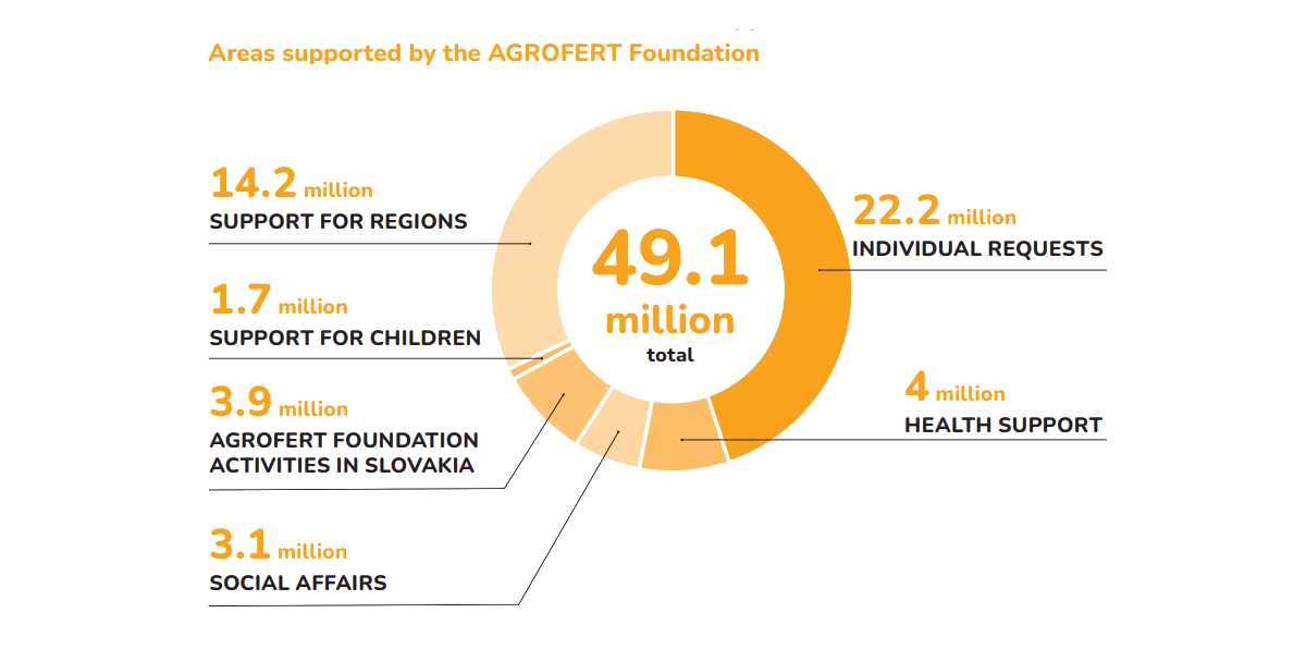 In addition to financial contributions from the AGROFERT Foundation, the various companies of the group undertake their own individual projects to provide support. The largest sums went to the areas of sport (CZK 6.5 million), social affairs (CZK 5 million), and support for communities (CZK 4.2 million). Moreover, the companies and their employees pursued hundreds of projects at the local level, with financial assistance starting at CZK 1,000.